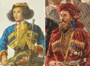 „მათ შორის ორი იპყრობდა განსაკუთრებულ ყურადღებას: ერთი მათგანი დიდებული თურქული იერის მქონე გახლდათ, ჰქონდა ხშირი და დიდი წვერი, თავზე ეხურა მაღალი ჩალმა, ძვირფასი ნაჭრის ისეთი ძველებური ტანსაცმელით იყო შემოსილი, რომ მისი შეხედვის შემდეგ უნებლიედ მეხსიერებაში წარმოგიდგებოდათ რემბრანტის ნახატზე გამოსახული ქურუმის სახე, ან რომელიმე ძველი მოგზაურის წიგნებში არსებული სულთანის გამოსახულება.